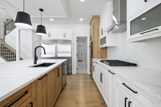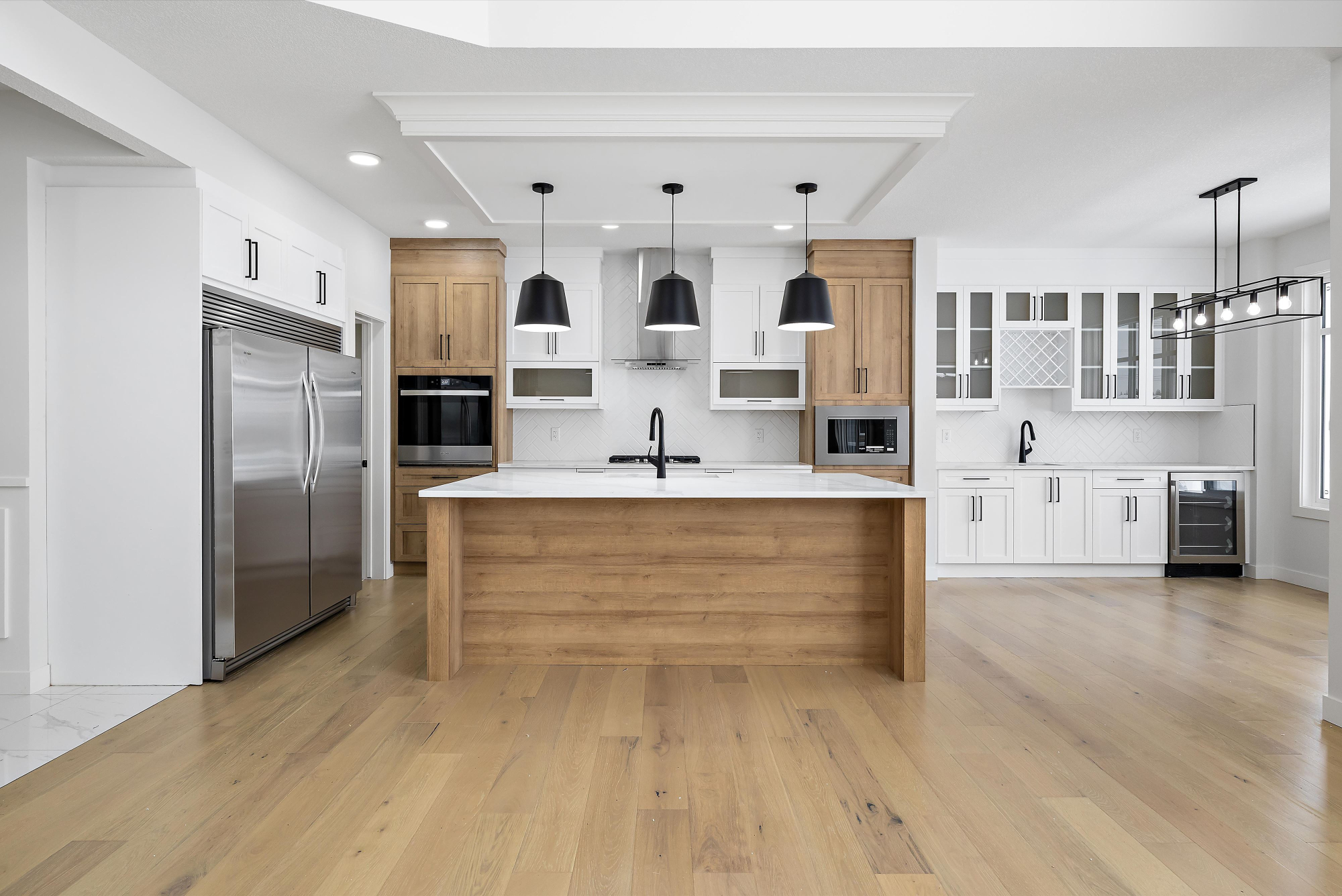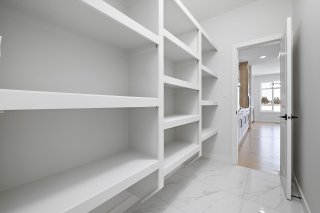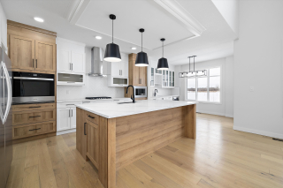 *The Kitchen contains stainless steel appliances, quartz countertops, soft-closing cabinetry, large island, spice racks, pull-out garbage bin, walk-through Pantry with MDF shelving, and optional wet bar.