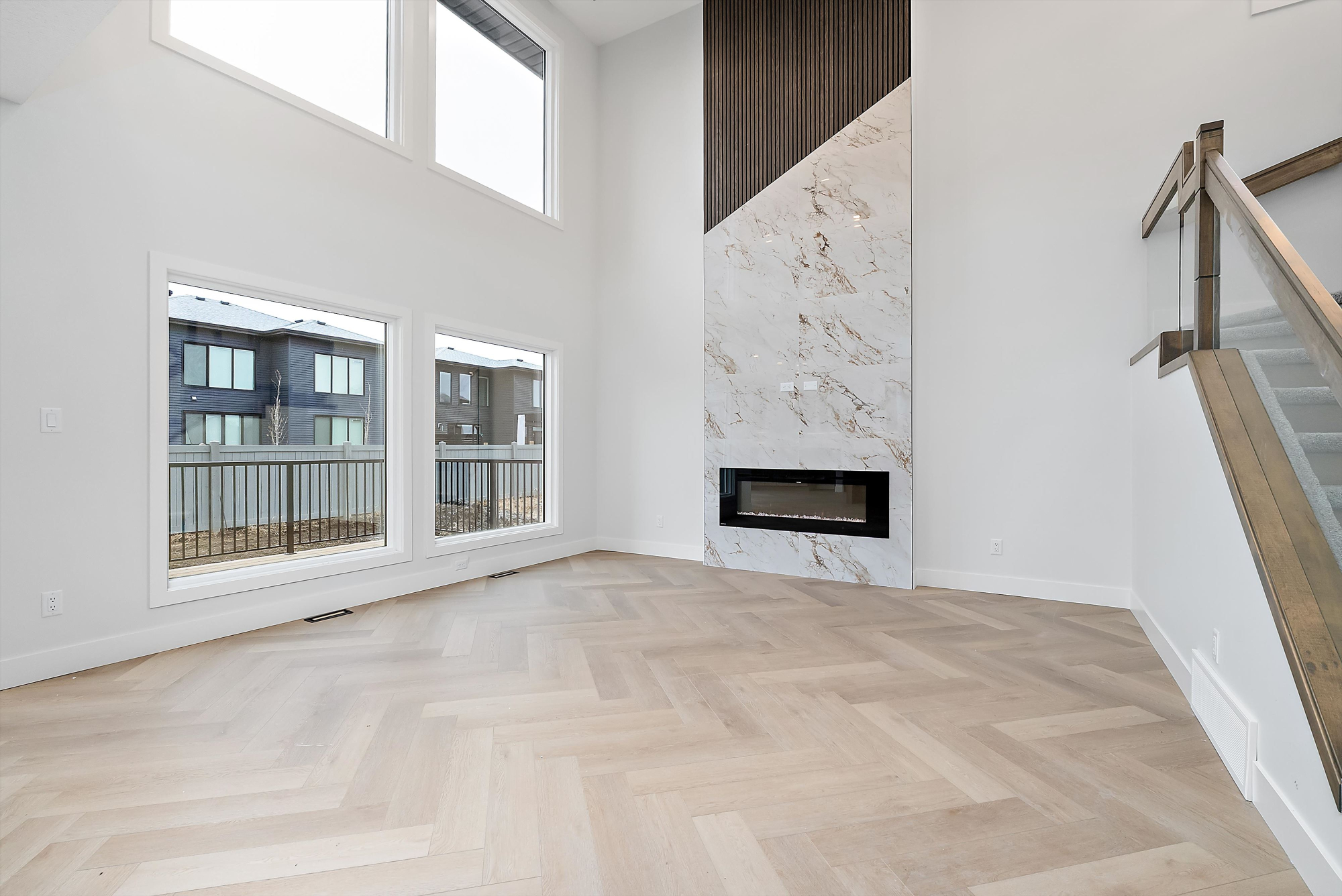 *The Great Room features 18-feet high ceilings and a 60-inch electric fireplace with stunning triple pane windows and optional boxed coffered ceiling.