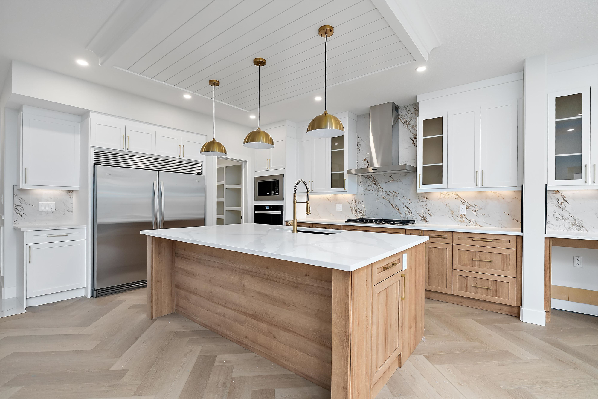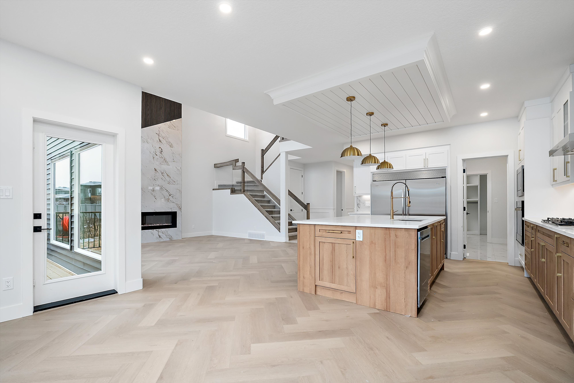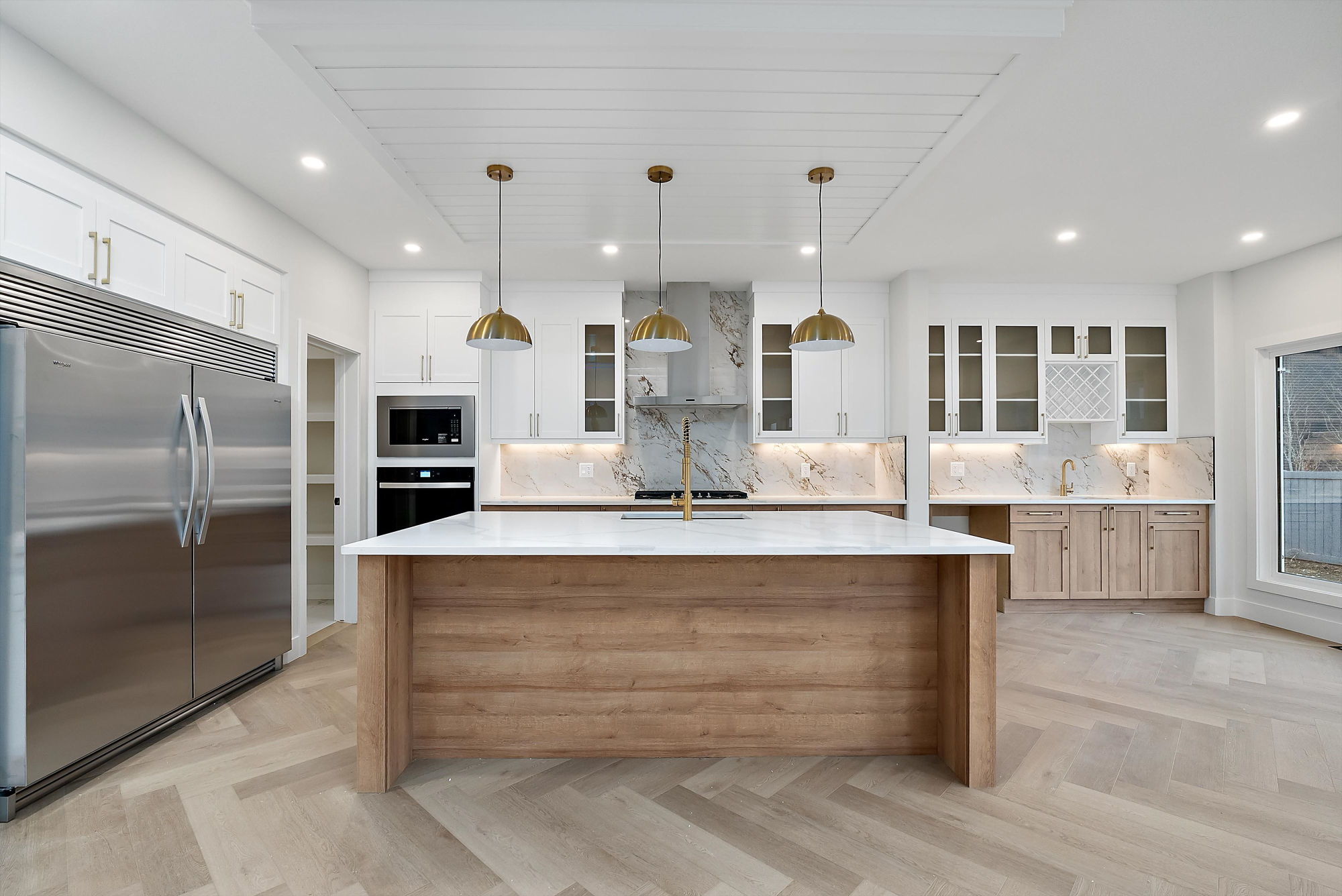 *The Kitchen contains stainless steel appliances, quartz countertops, soft-closing cabinetry, large island, spice racks, pull-out garbage bin, and walk-through Pantry with MDF shelving.